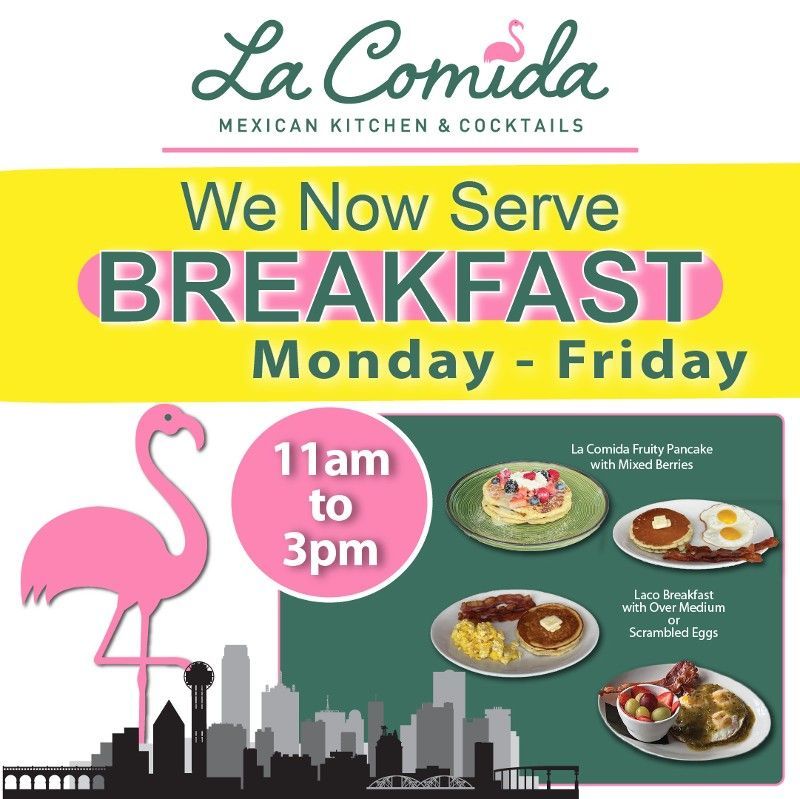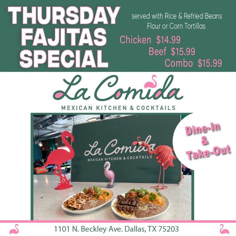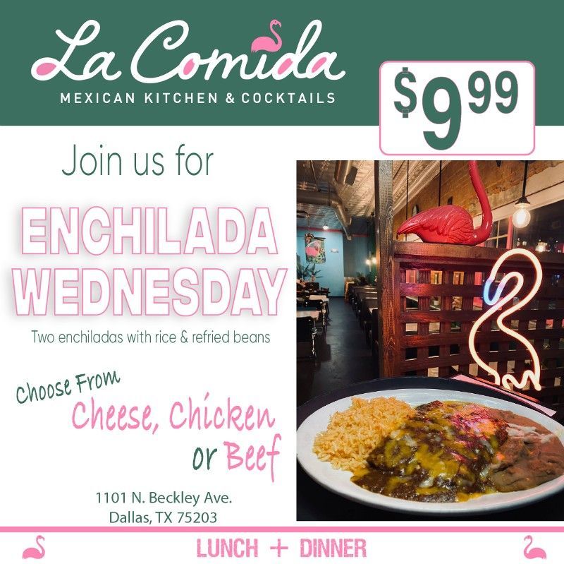 La Comida Mexican Kitchen and Cocktails offers a unique dining experience with our elevated Tex-Mex classics and Yucatán inspired dishes. From 'tropical' ceviches to mango-jicama-shrimp salads, our menu is bursting with flavors that will transport you to the streets of Mexico. As a local family Mexican restaurant in Dallas, TX, we're thrilled to return to the Oak Cliff neighborhood, which we once called home in the 90s. With our unmatched hospitality and Yucatan decor, you'll feel right at home. Don't miss our signature margarita, The Flamingo, an organic margarita with a pink sangria swirl. Located near the Bishop Arts District in North Oak Cliff, we now serve breakfast and brunch too. Join us for an unforgettable dining experience!